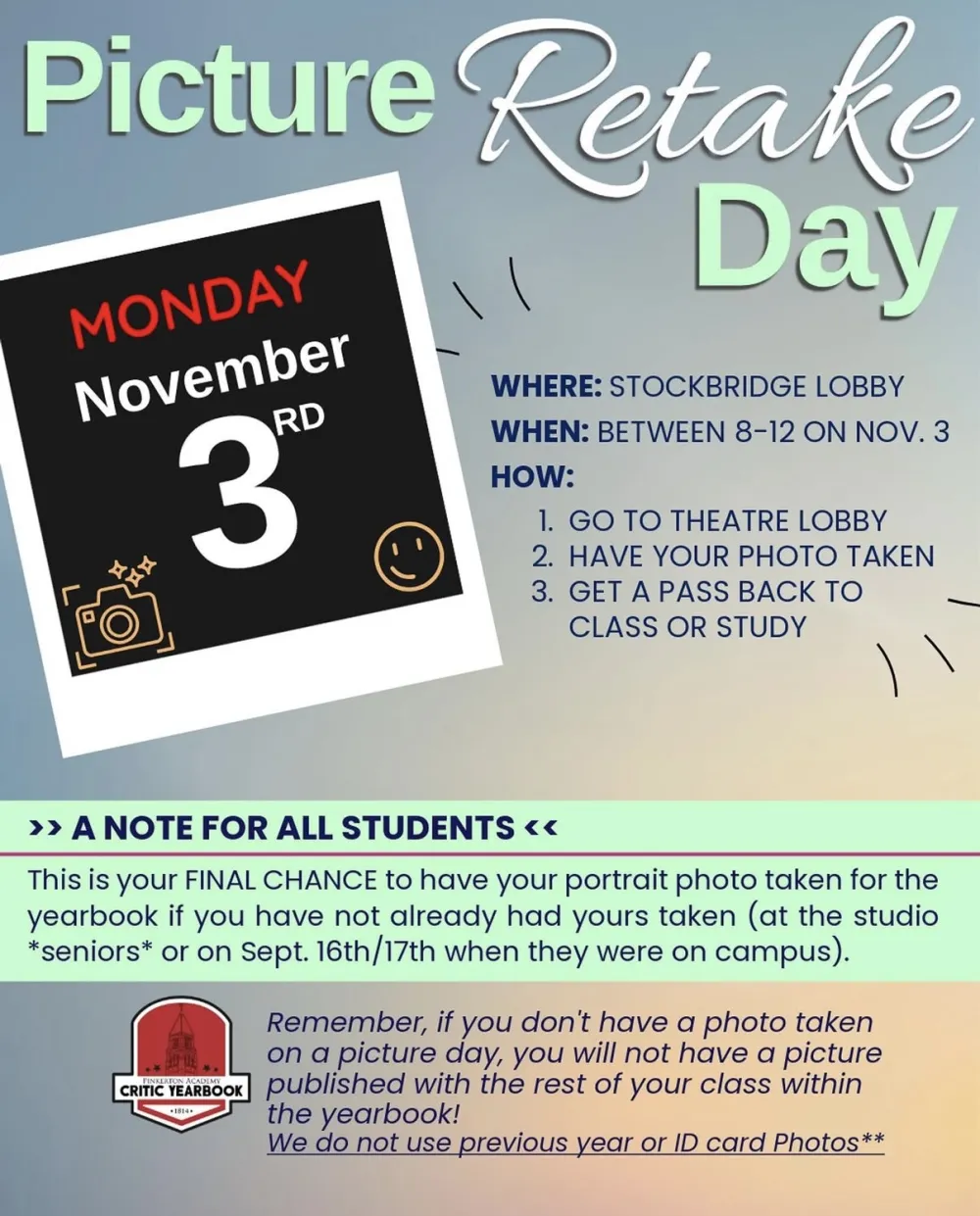 Picture Retake Day will take place on November 3rd from 8:00 AM - 12:00 PM in the Stockbridge Theatre Lobby.