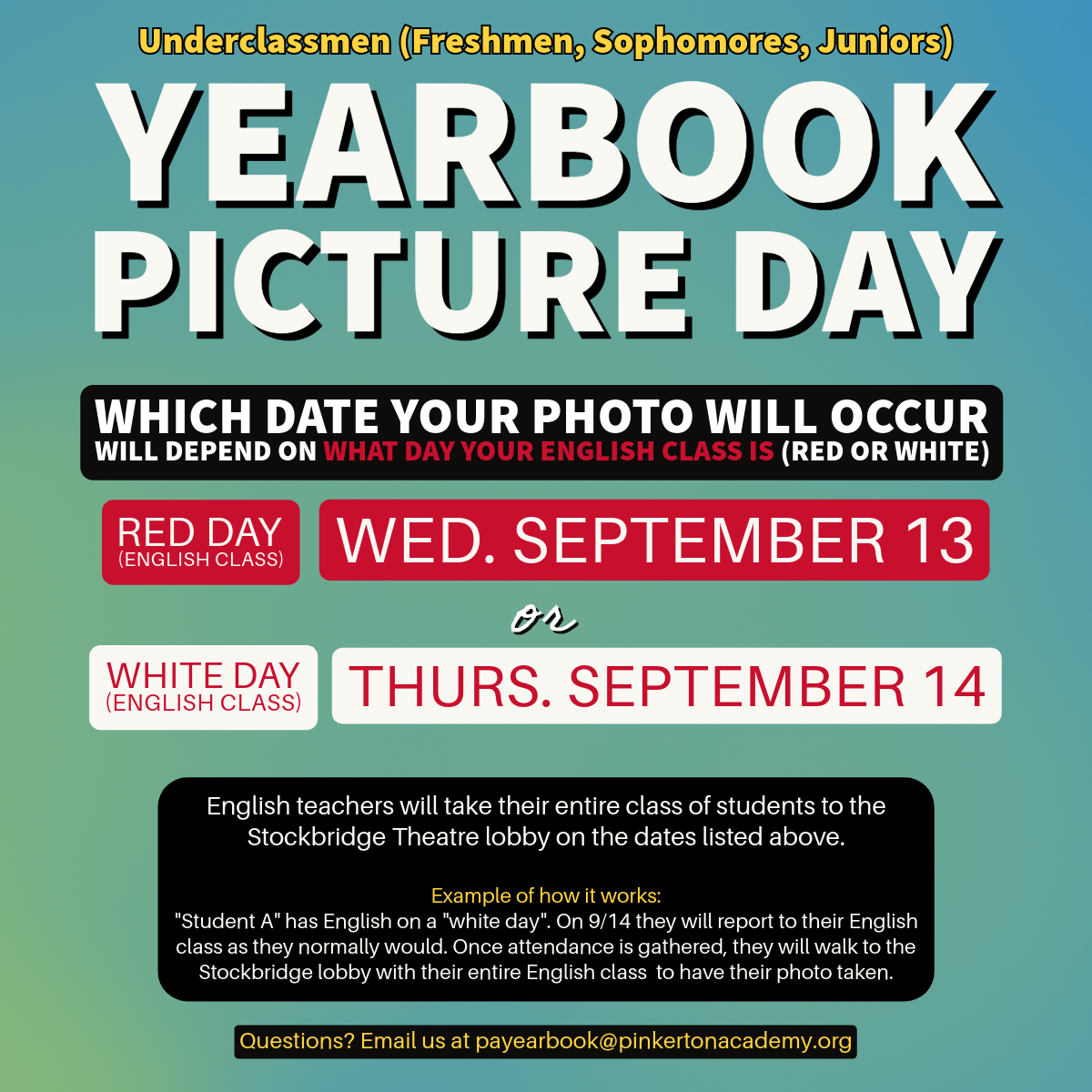 Again, yearbook photos must come from Mark Lawrence Photographers (they are Pinkerton’s official photographer). The school’s policy is not to use junior class photos and/or student ID photos for those who do not get their senior pictures taken with the school photographer by the due date. We do not want anyone left out of the 2024 yearbook, so do not delay.