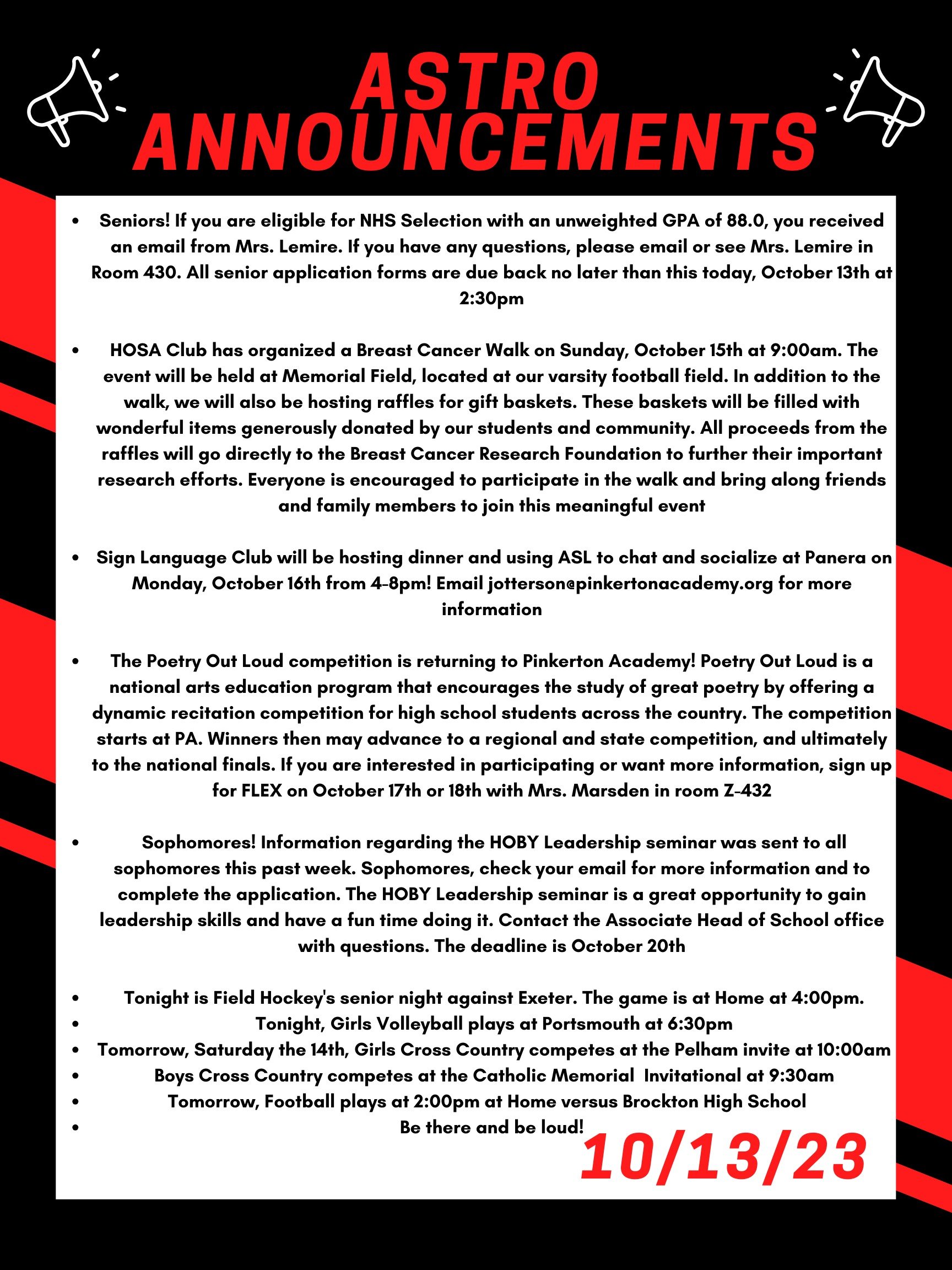 Seniors! If you are eligible for NHS Selection with an unweighted GPA of 88.0, you received an email from Mrs. Lemire. If you have any questions, please email or see Mrs. Lemire in Room 430. All senior application forms are due back no later than this today, October 13th at 2:30 p.m.